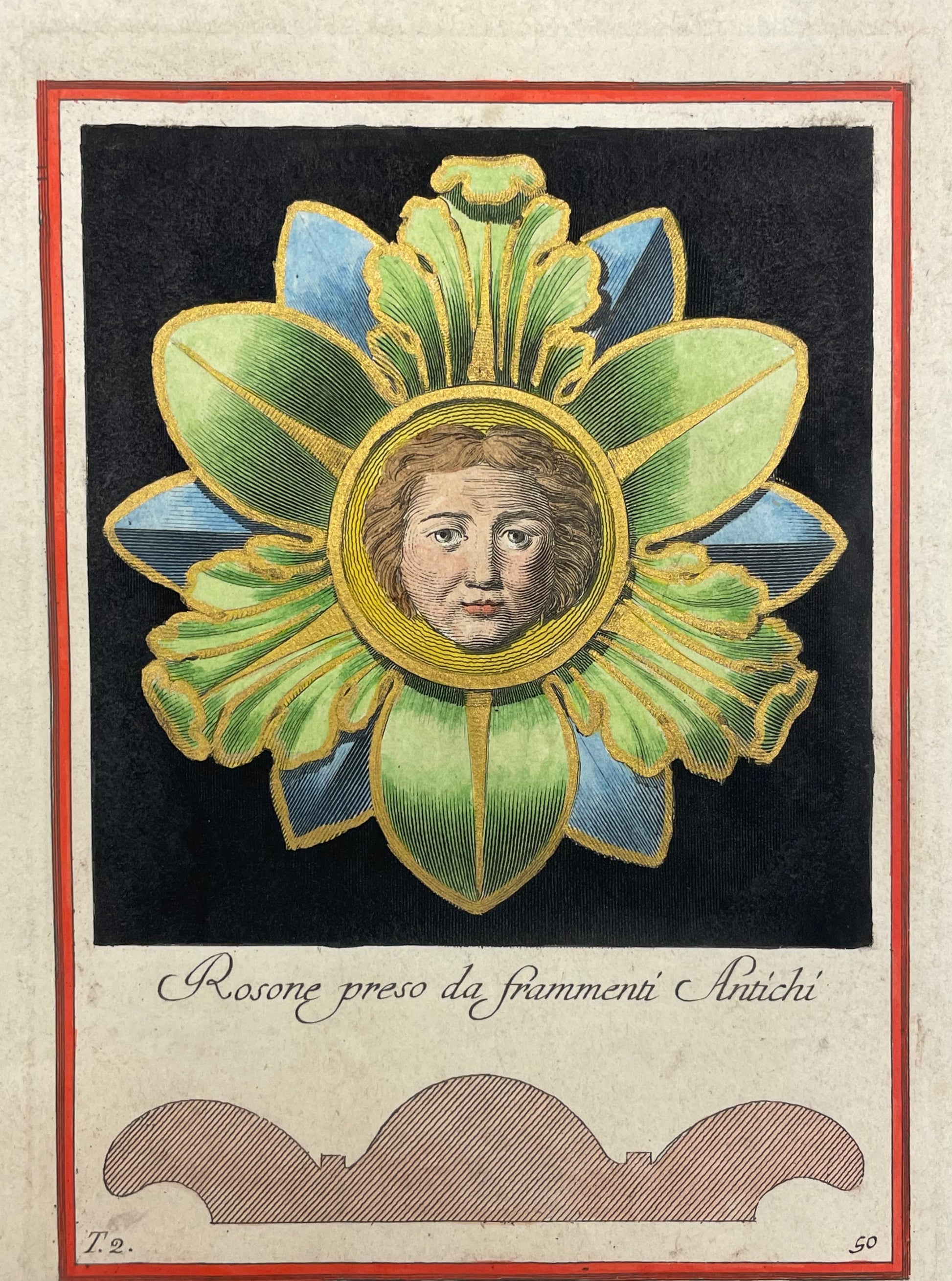 Carlo Antonini was a designer, copperplate engraver, and architect who flourished in the late 18th century and into the early 19th century. Active in Rome and Modena, Antonini produced two great collections of ornamental copperplate engravings. The first of which was titled Manuale di vari Ornamenti, tratti dal Fabbriche e Frammenti Antichi, per uso e commodo de’ pittori, scultori, architetti, scarpellini, stuccatori and was published in Rome in four parts between 1781-1790. The first two parts were devoted to rosettes, including 100 plates, which appeared on exterior and interior Italian Renaissance houses and palaces.