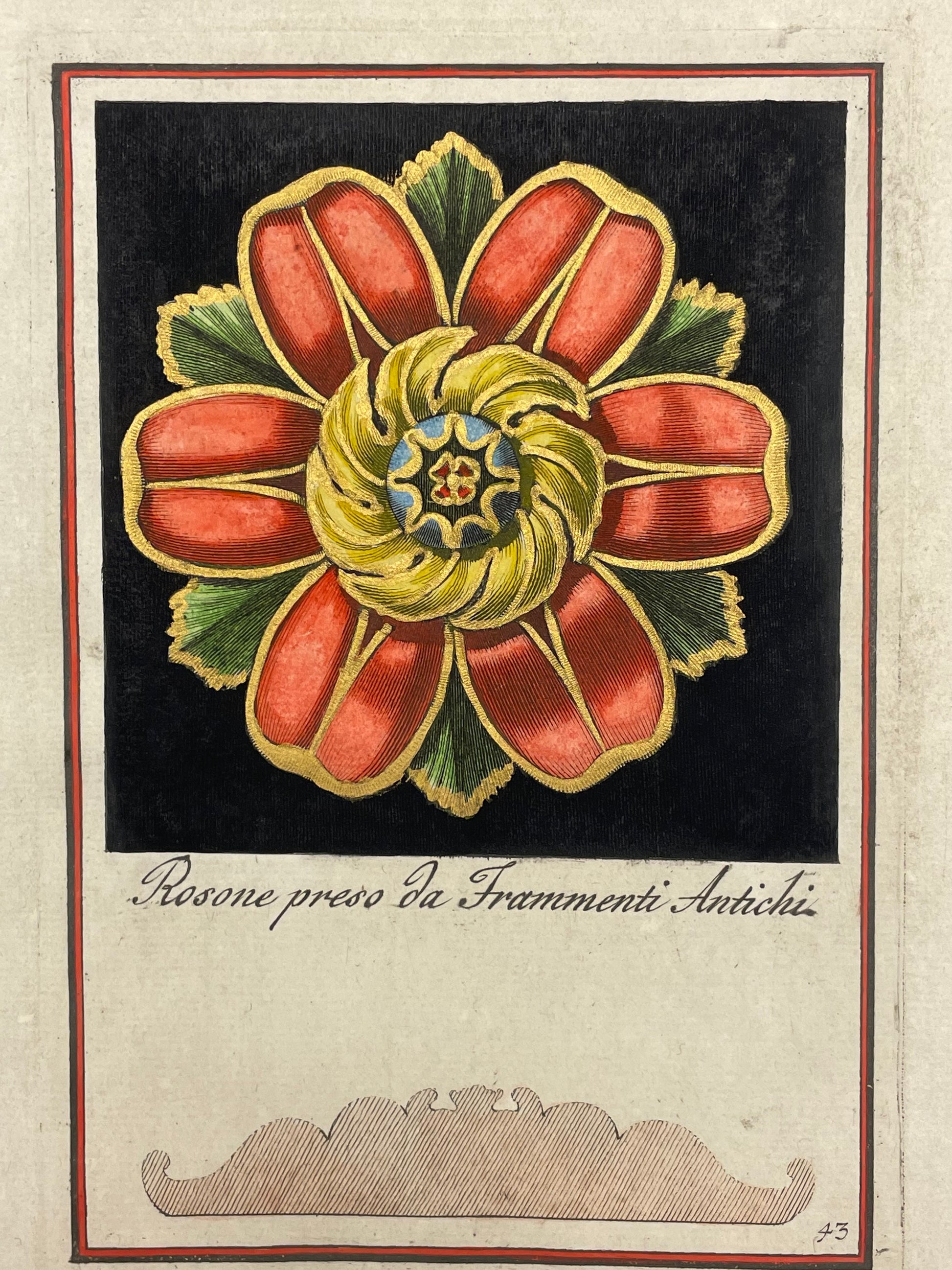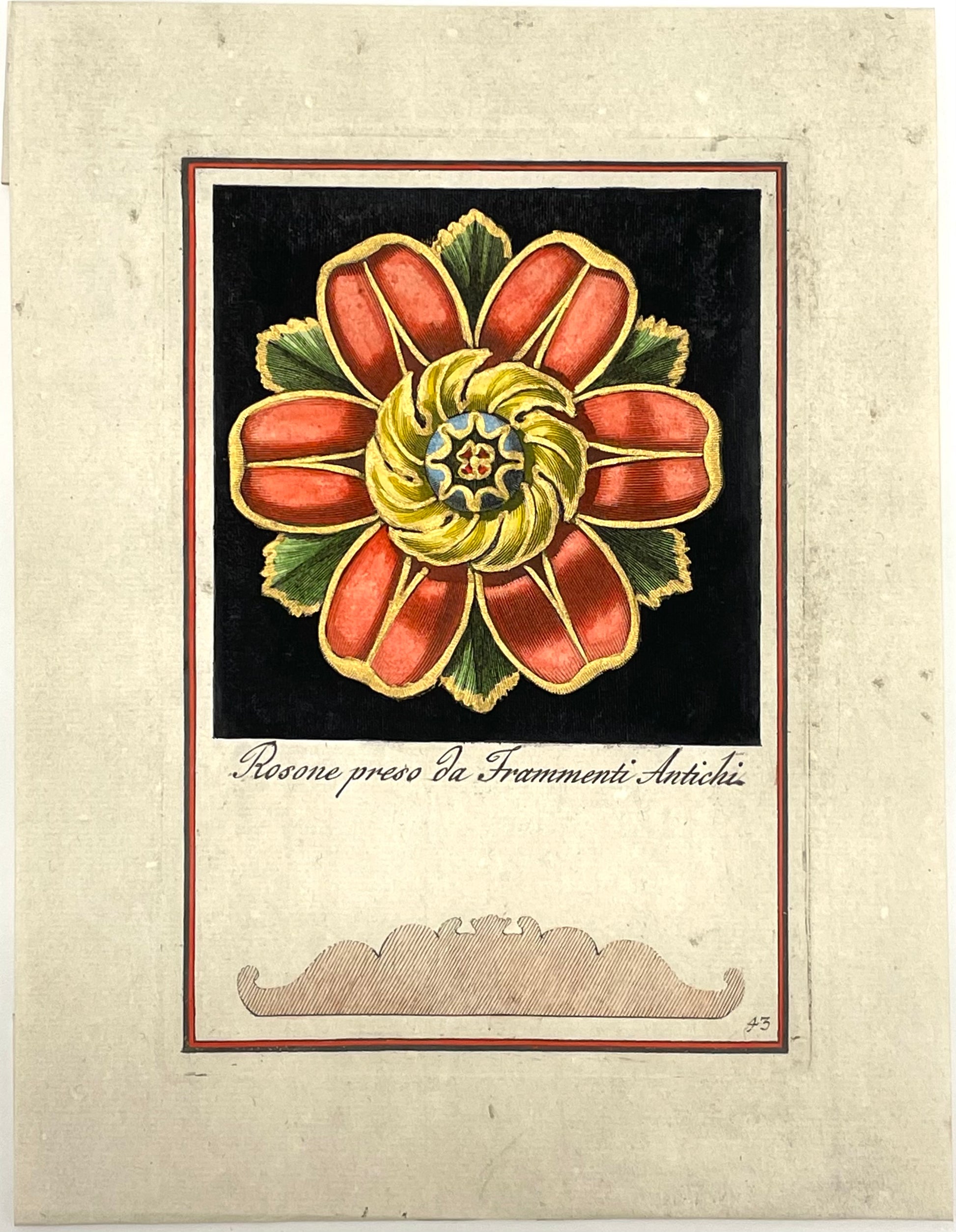 Carlo Antonini was a designer, copperplate engraver, and architect who flourished in the late 18th century and into the early 19th century. Active in Rome and Modena, Antonini produced two great collections of ornamental copperplate engravings. The first of which was titled Manuale di vari Ornamenti, tratti dal Fabbriche e Frammenti Antichi, per uso e commodo de’ pittori, scultori, architetti, scarpellini, stuccatori and was published in Rome in four parts between 1781-1790. The first two parts were devoted to rosettes, including 100 plates, which appeared on exterior and interior Italian Renaissance houses and palaces.