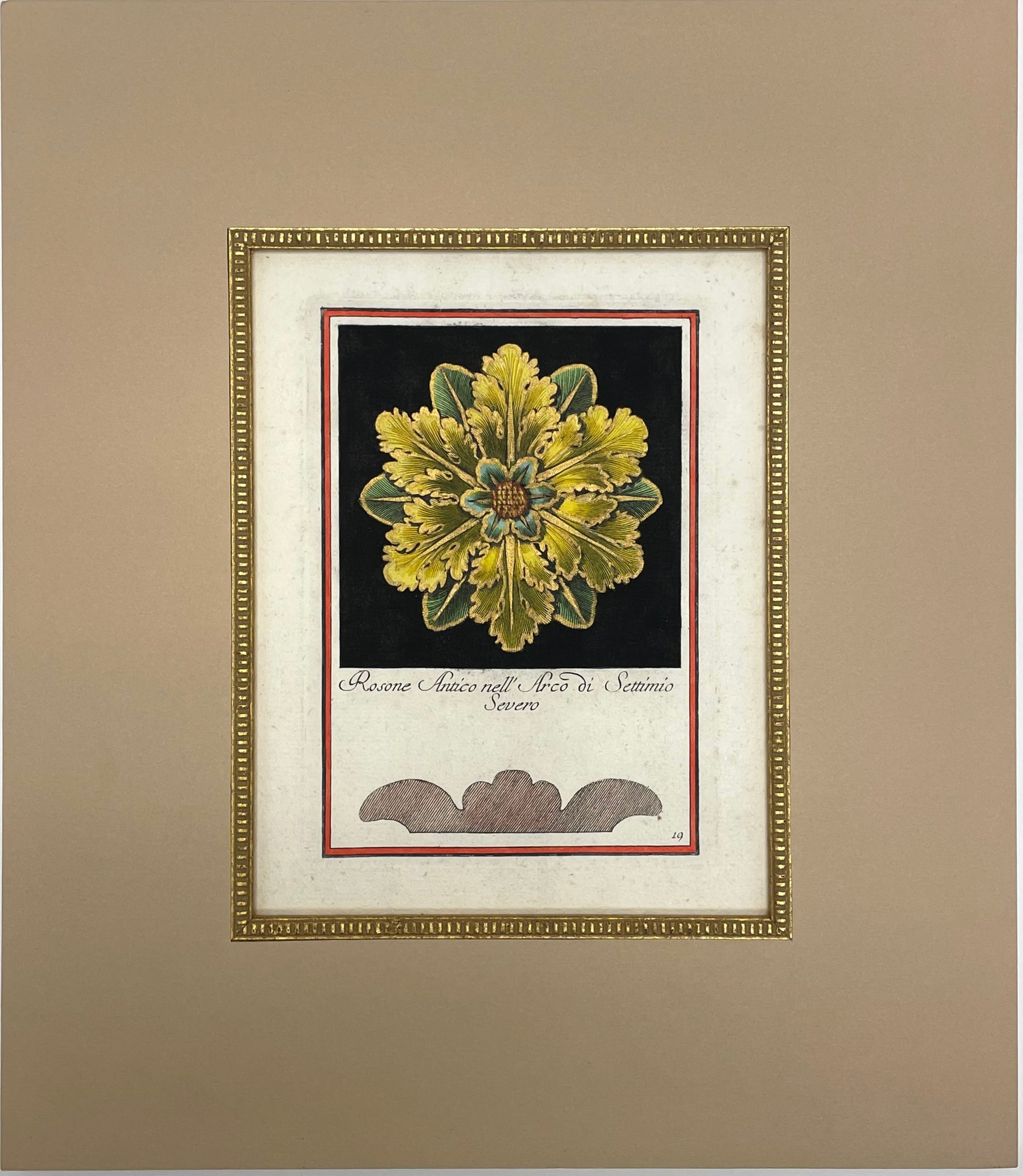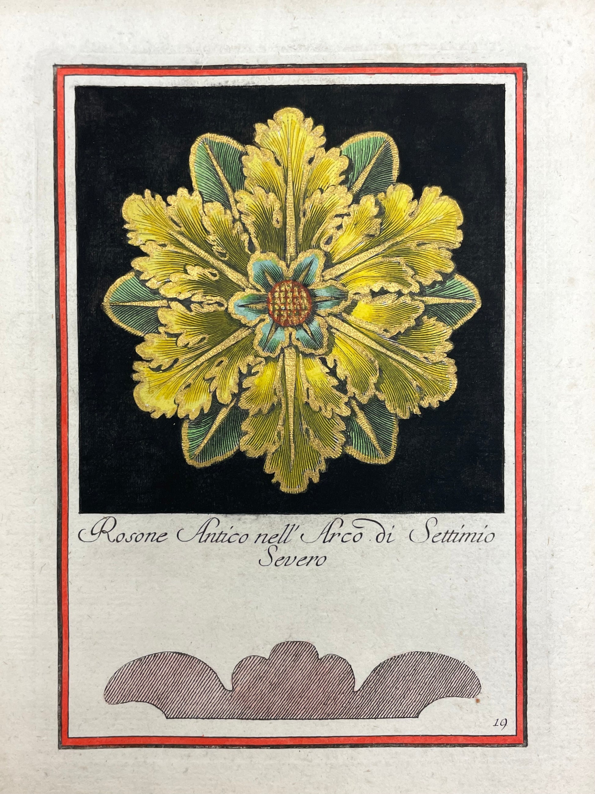 Carlo Antonini was a designer, copperplate engraver, and architect who flourished in the late 18th century and into the early 19th century. Active in Rome and Modena, Antonini produced two great collections of ornamental copperplate engravings. The first of which was titled Manuale di vari Ornamenti, tratti dal Fabbriche e Frammenti Antichi, per uso e commodo de’ pittori, scultori, architetti, scarpellini, stuccatori and was published in Rome in four parts between 1781-1790. The first two parts were devoted to rosettes, including 100 plates, which appeared on exterior and interior Italian Renaissance houses and palaces.