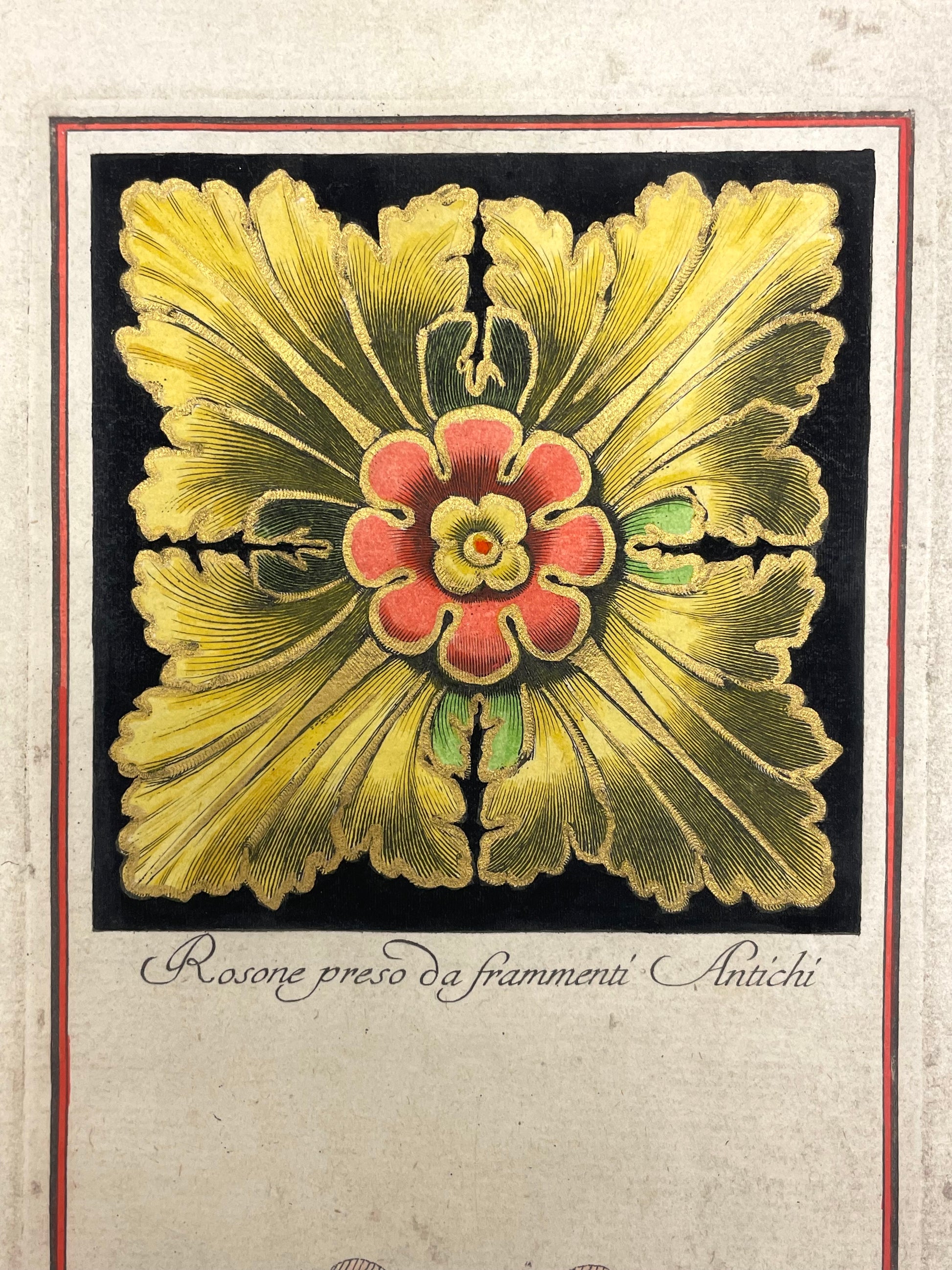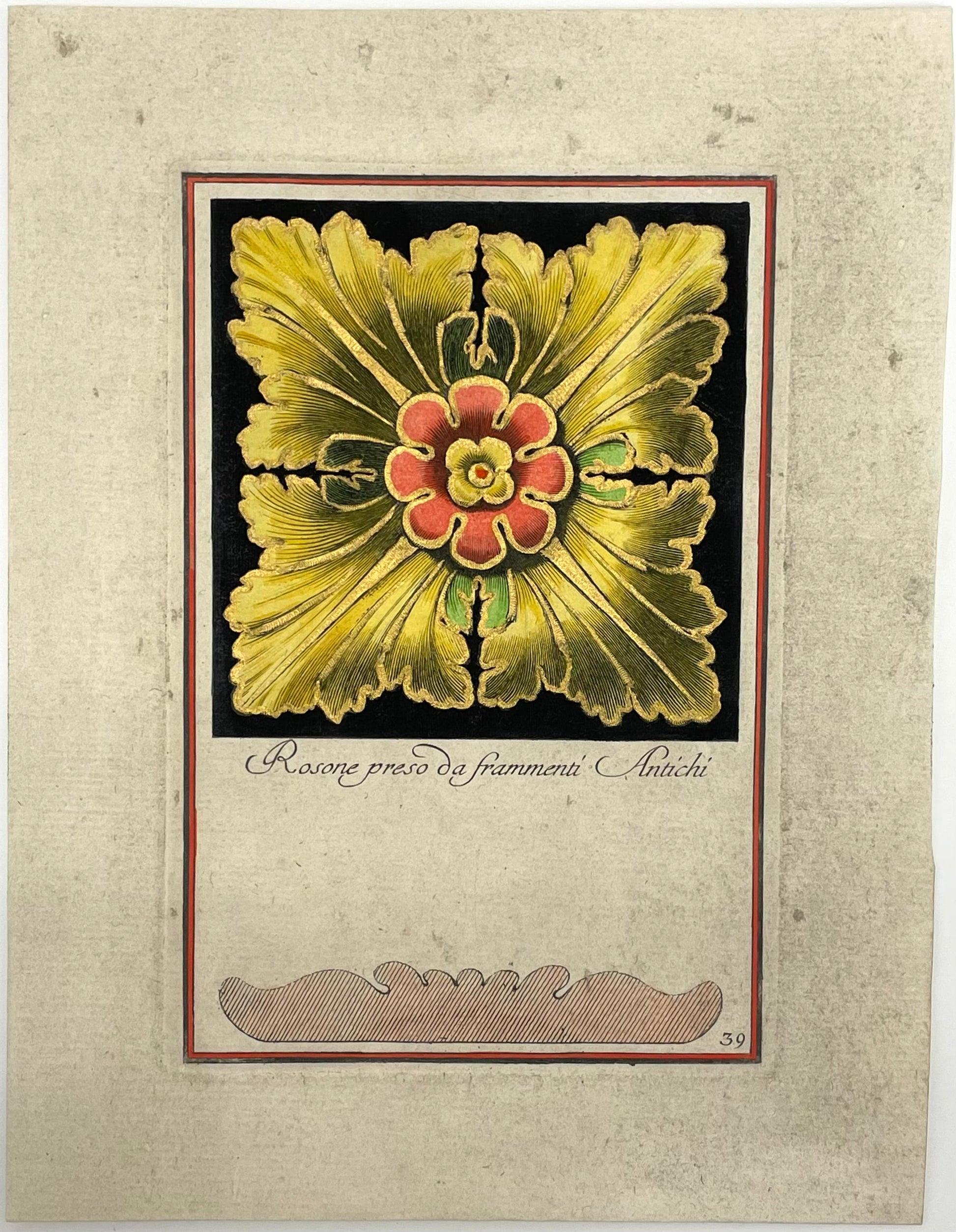 Carlo Antonini was a designer, copperplate engraver, and architect who flourished in the late 18th century and into the early 19th century. Active in Rome and Modena, Antonini produced two great collections of ornamental copperplate engravings. The first of which was titled Manuale di vari Ornamenti, tratti dal Fabbriche e Frammenti Antichi, per uso e commodo de’ pittori, scultori, architetti, scarpellini, stuccatori and was published in Rome in four parts between 1781-1790. The first two parts were devoted to rosettes, including 100 plates, which appeared on exterior and interior Italian Renaissance houses and palaces.