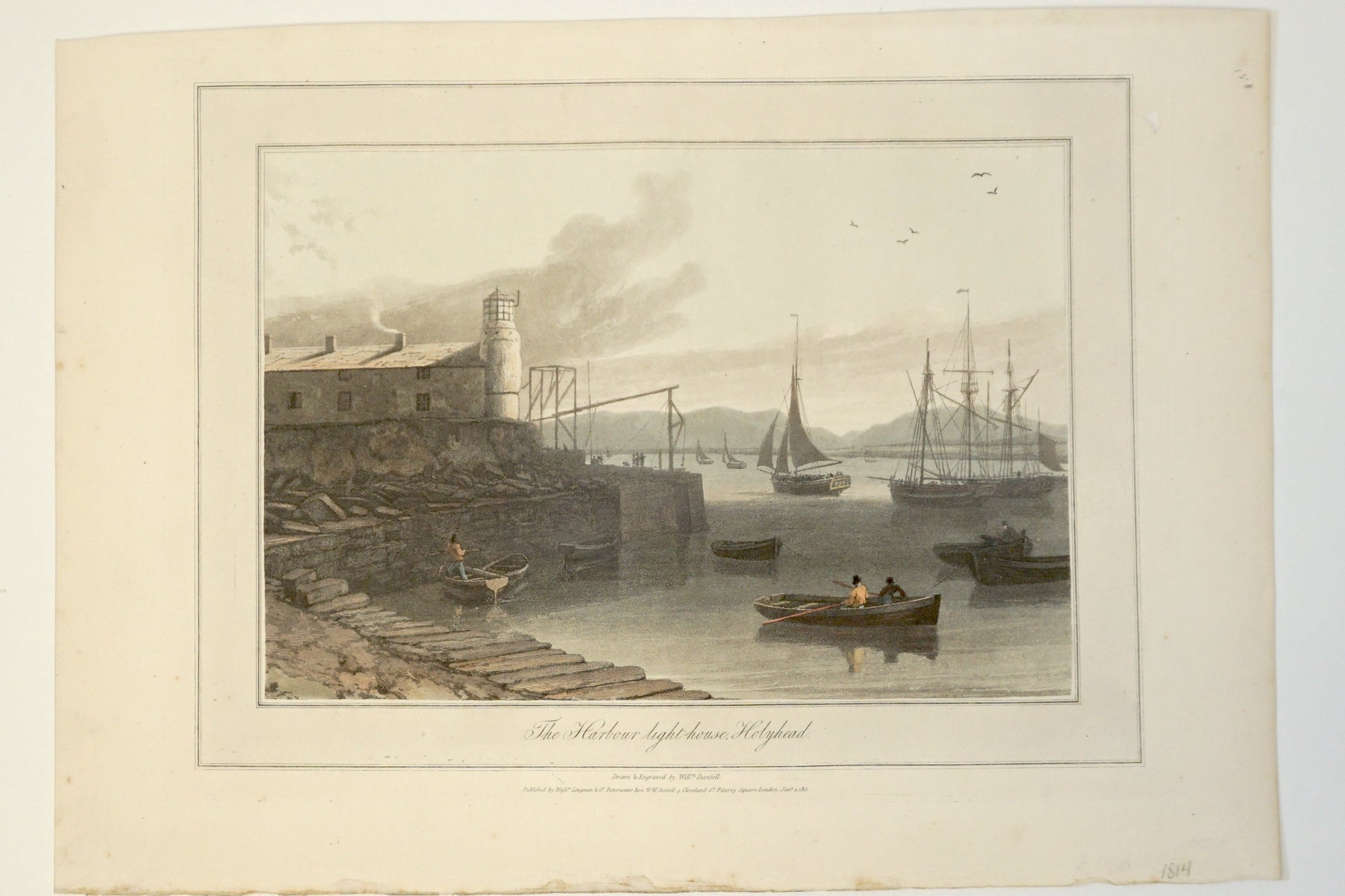 This original hand-colored engraving was published by William Daniell in London in 1814. This piece details the coastline of The Harbour Lighthouse Holyhead. This engraving of the lighthouse and its harbour. You can witness people in their boats, ships out at sea, and the lighthouse on the coastline.
