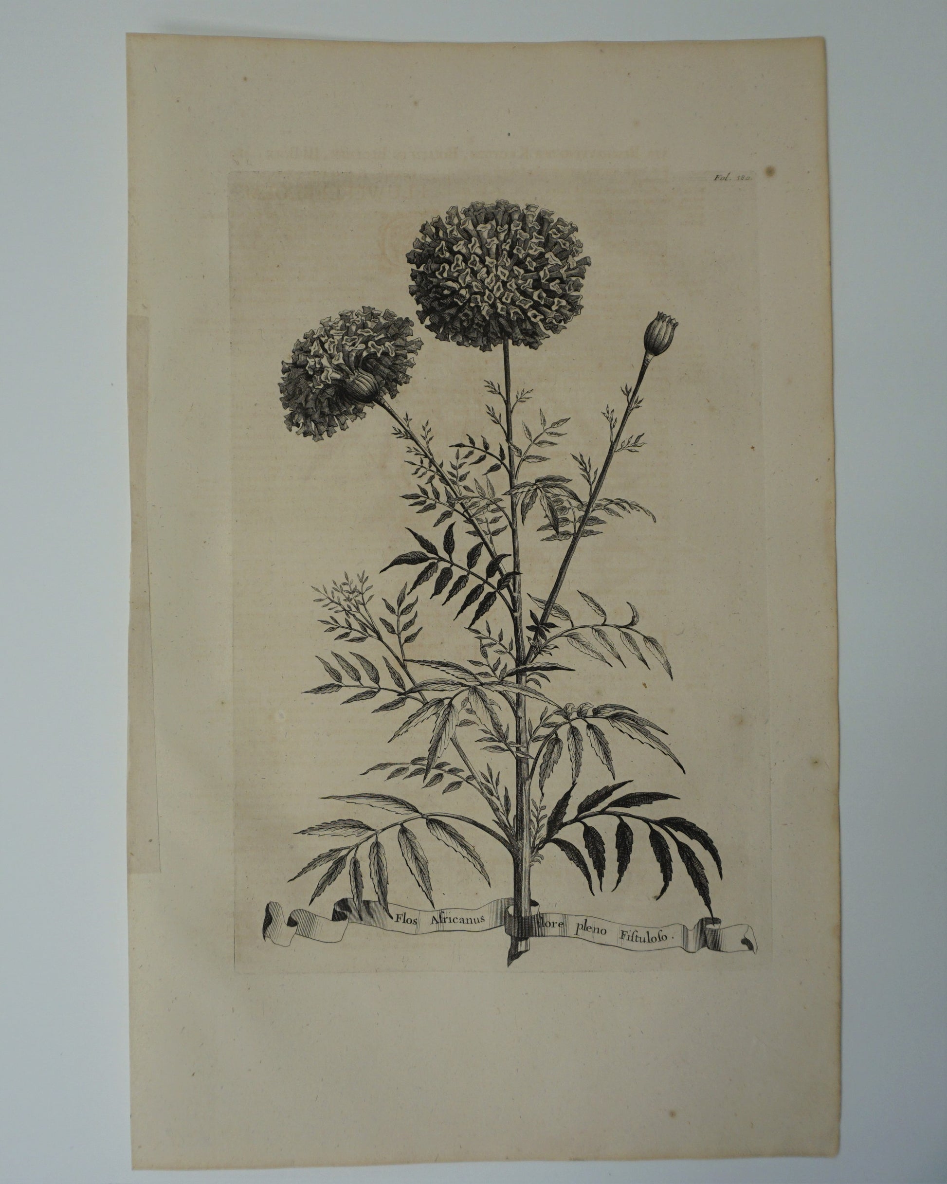 Etching Engraving of Flos Africanus and Flore Pleno Fiftulofo, Abraham Munting, 1696