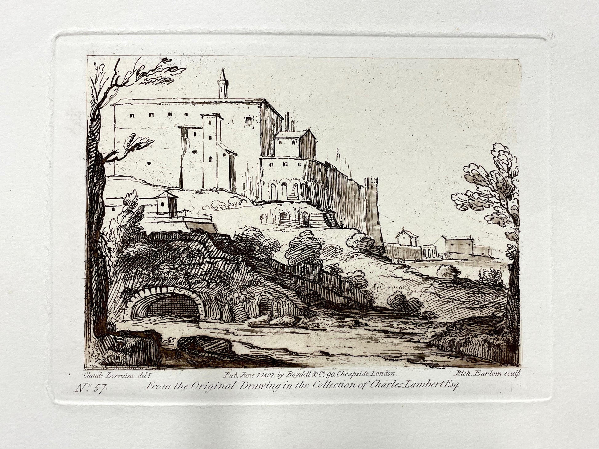 Each piece in this collection is a landscape engraving created by Claude Lorrain, engraved by Richard Earlom, and published by John Boydell showcasing different perspectives of nature throughout London, such as towns, hillsides, and seashores.