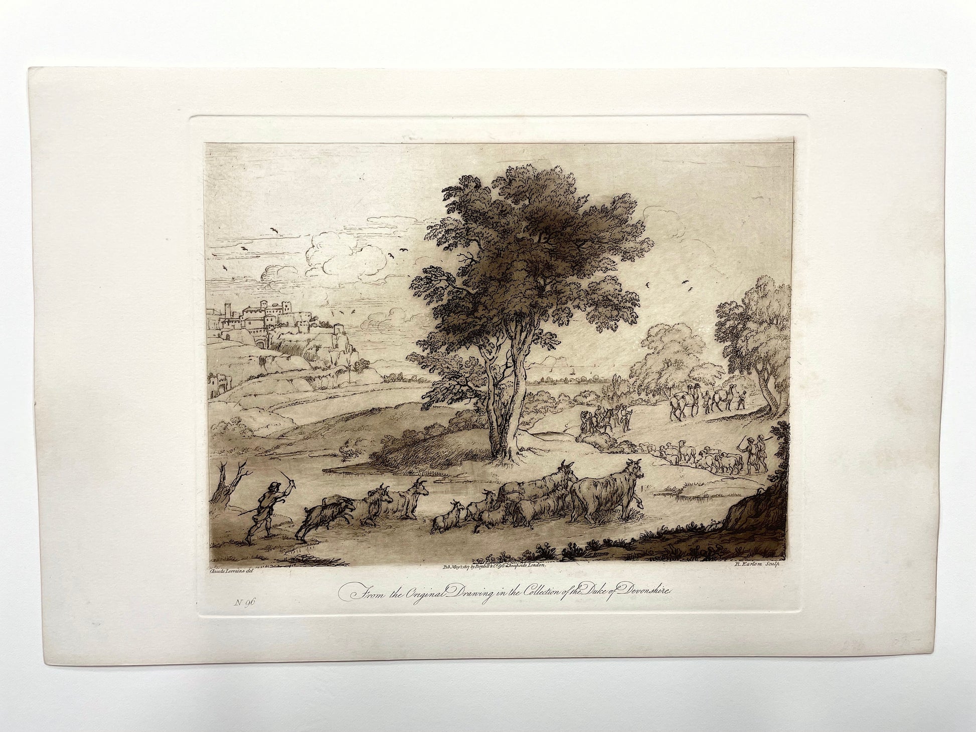 Each piece in this collection is a landscape engraving created by Claude Lorrain, engraved by Richard Earlom, and published by John Boydell showcasing different perspectives of nature throughout London, such as towns, hillsides, and seashores.