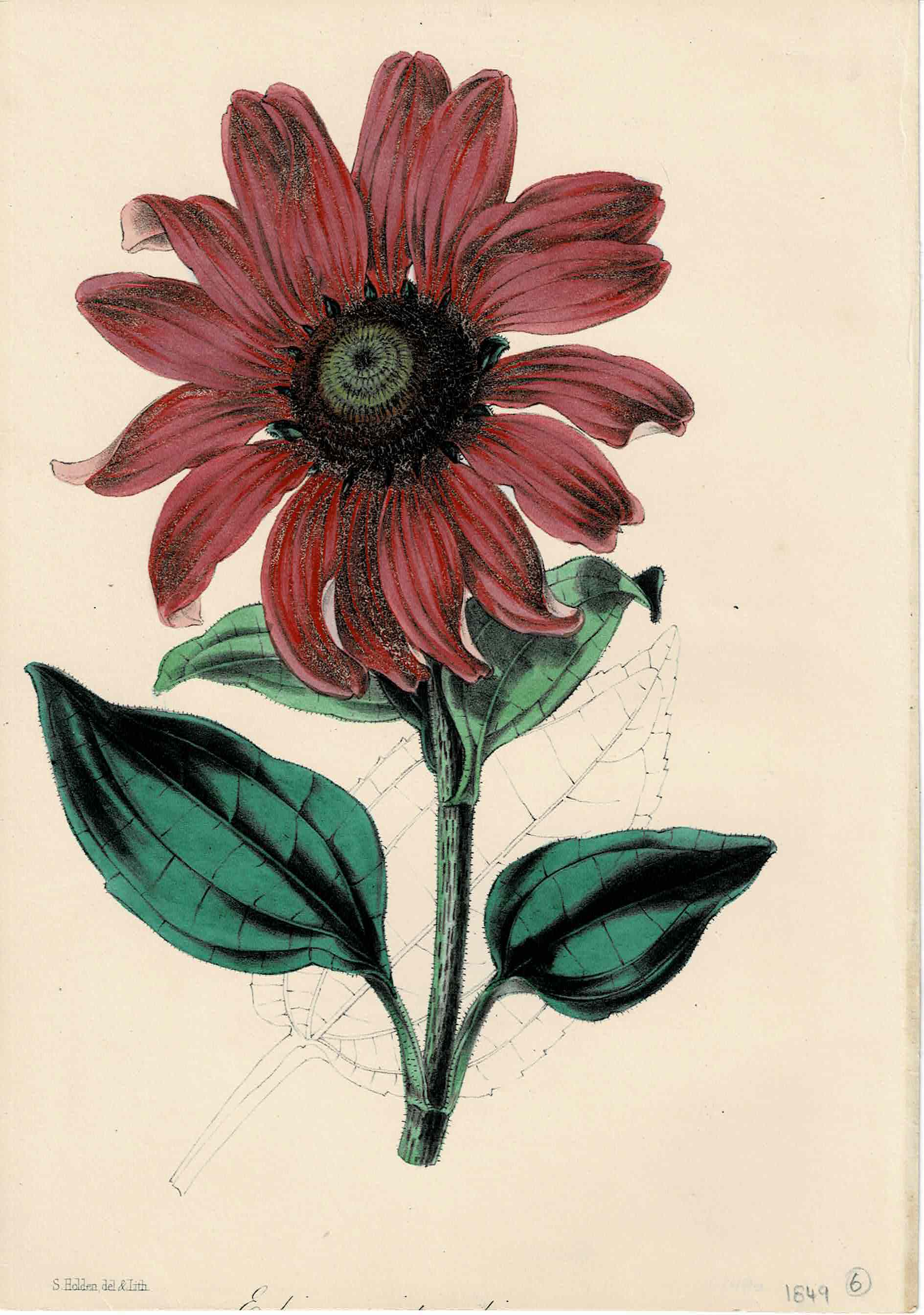 This hand-colored lithograph is unfinished, highlighting how individualized hand-colored prints can be. The center of the flower is also painted with a glossy finish, giving it a soft shine. The bottom of the page displaying the name of the flower has been trimmed off.