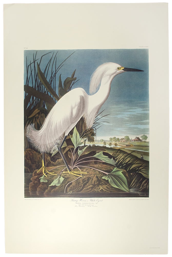 Snowy Heron is one of the most desirable plates in the Birds of America, Audubon's masterpiece. This stunning reproduction issue was made using a now antiquated printing technique called collotype which yields quite rich, oil paint-type colours. The Leipzig edition of Audubon's Birds was produced in the early 1970s. The plan was to reproduce 40 plates: 20 vertical and 20 horizontal from Audubon's work of which 500 would be bound in two vol;umes and 500 would be sold loose. Not all the plates produced were used however including this marvellous rendition of the Snowy Heron, one of the most popular and evocative of all Audubon's Birds. It is consequently quite rare.