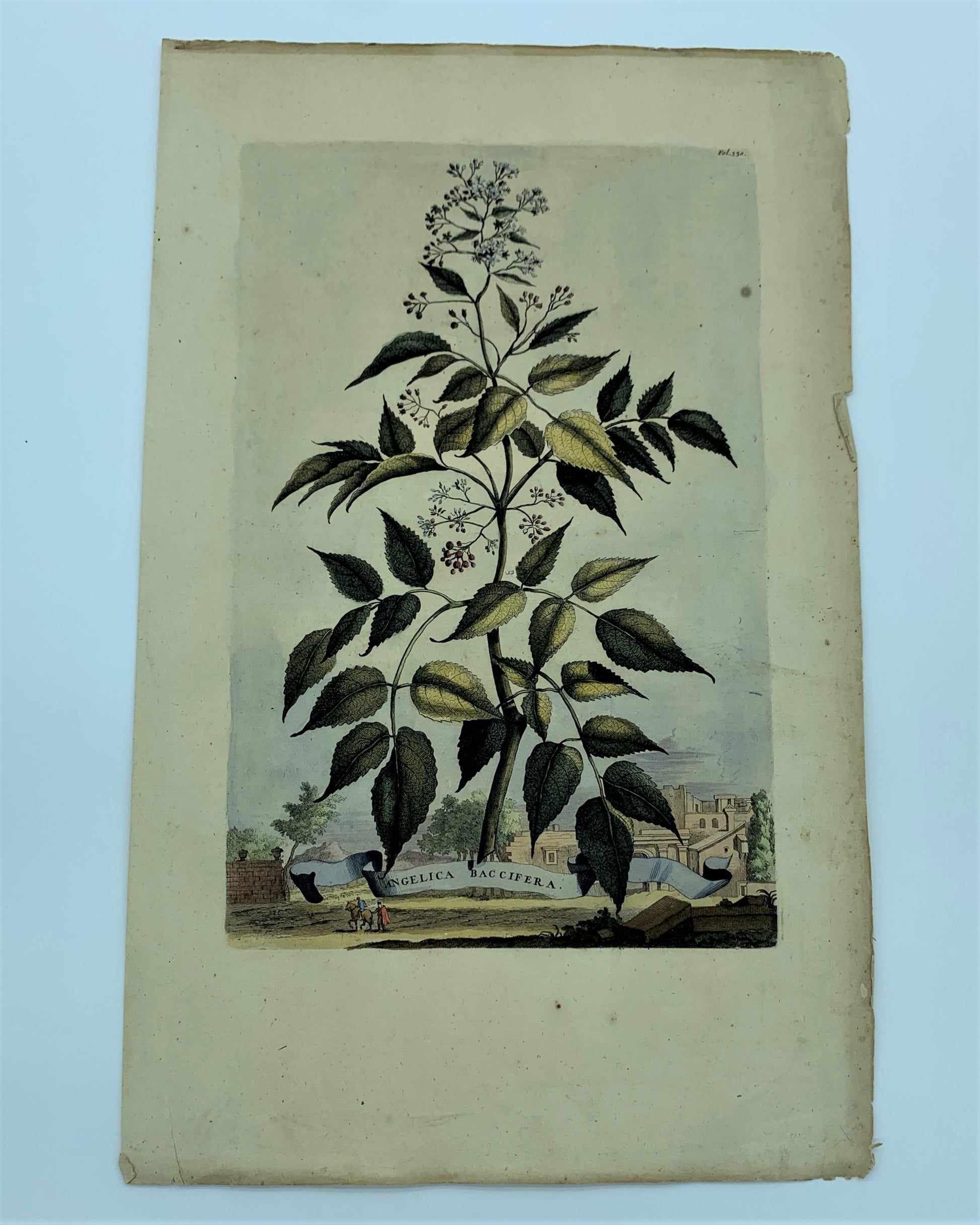 Condition: Overall the art piece is in very good condition. Toning as expected due to age. Mild foxing and staining throughout the art piece. Slight acidic matting on the sides of the etching. Some creasing on the corners of the etching. Overall paper is healthy and colors are vibrant.