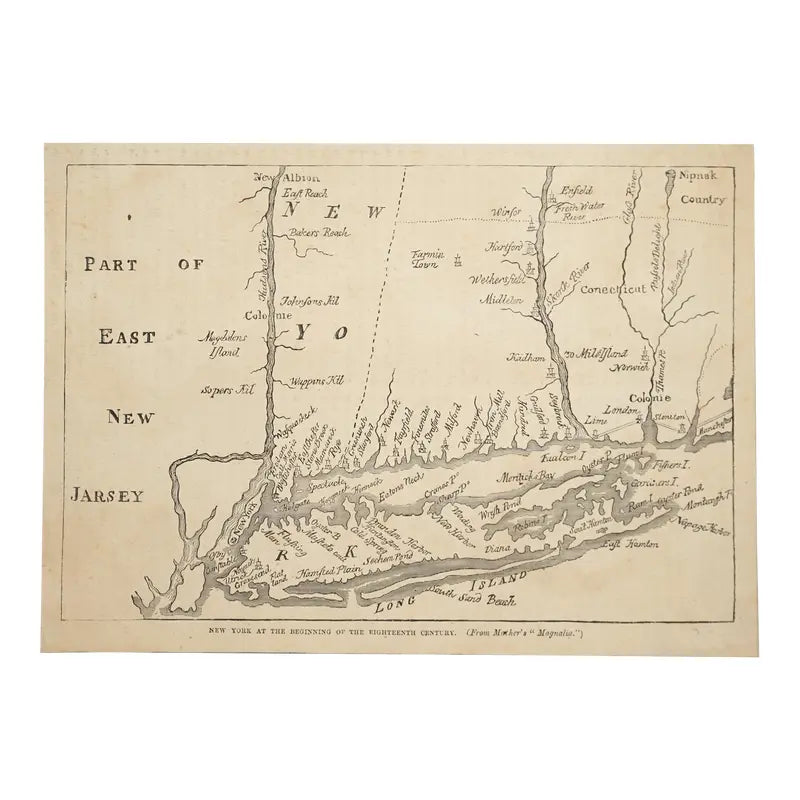 This antique print has been hand written and draw. It displays the lower east side of New Jersey, during the early 18th century. You can easily see the major cities, counties, and even a couple of beach areas. This original print also contains a rare miss-spelling of the word New Jersey.