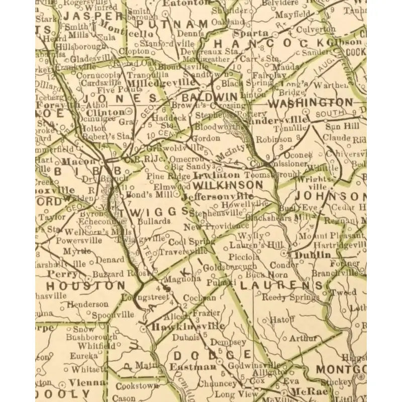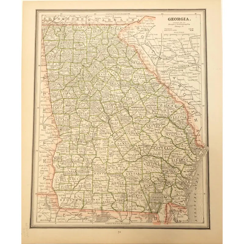 This antique print displays the counties, main roads, cities, rivers, lakes and a small viewing of the Atlantic Ocean and the borders of the states surrounding Georgia. Published by the People's Publishing Company in Chicago, Illinois. The reverse of the map shows South Carolina in the same style.