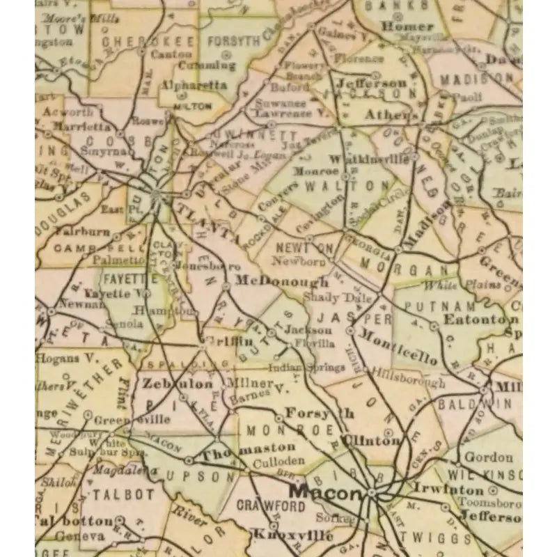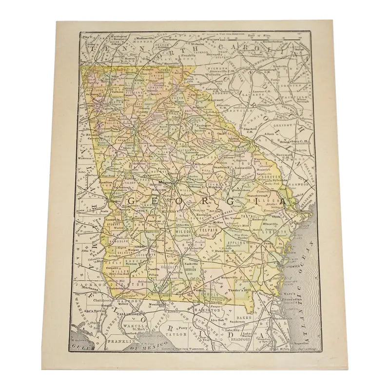 This antique map depicts the cities, counties, regions, railroads in the state of Georgia. It also showcases the states and bodies of water that surround Georgia.