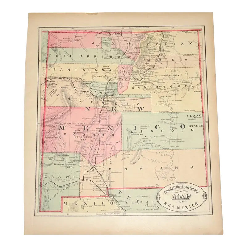 This map of New Mexico depicts the cities, counties, railroads, routes and natural landscapes.