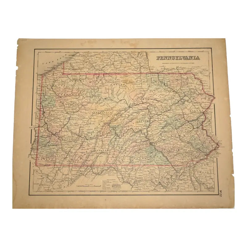 Original Antique Map of Pennsylvania, (Usa), C. 1838