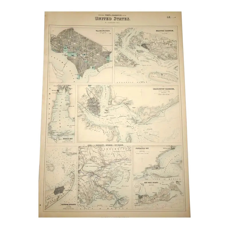 Original Antique Map of Southern Ports and Harbors, Usa, C.1800