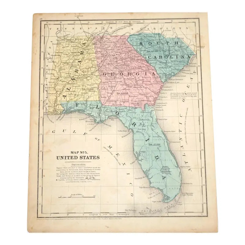 This map is a depicts the major cities, counties, regions, routes and natural landscapes, of four southern states: South Carolina, Alabama, Georgia and Florida. The population around the time this map was created in included as well. This maps also showcases the surrounding states and the two major bodies of water: The Atlantic Ocean and the Gulf of Mexico.