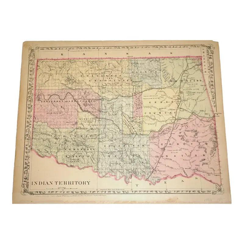 This map depicts the thirteen Indian territories to include: the Choctaw Nation, Chickasaw Nation, Creek county, in the Great Plains. Locations of the Treaties, that were signed are showcased, as well as the year, a couple of cities, the railroads, rivers, lakes, and surround states.