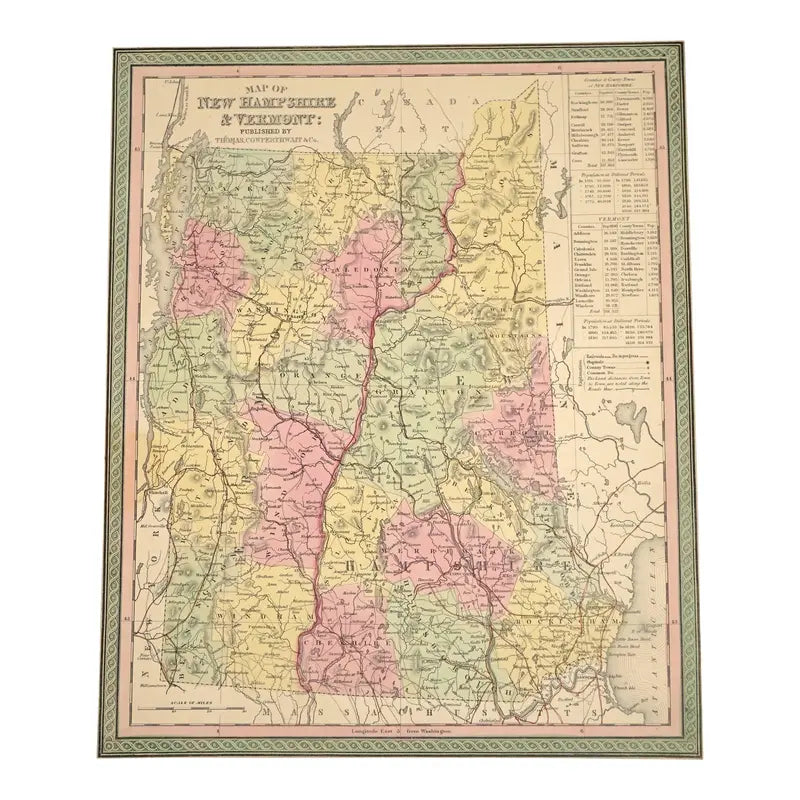 Original Antique Print New Hampshire & Vermont Map,