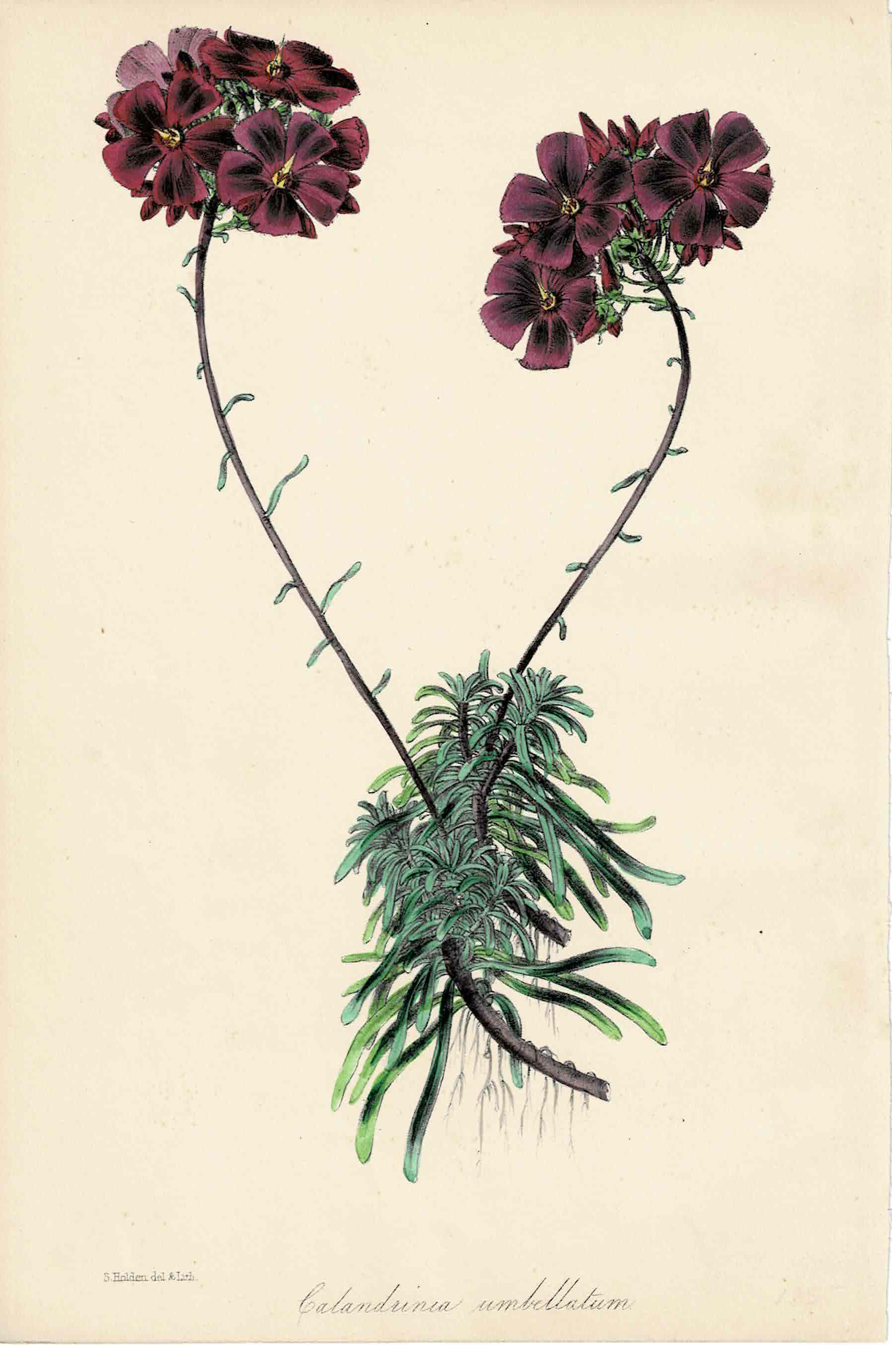 Purple Hand-Colored Botanical, Calandrinia Umbellatum, c. mid-1800s