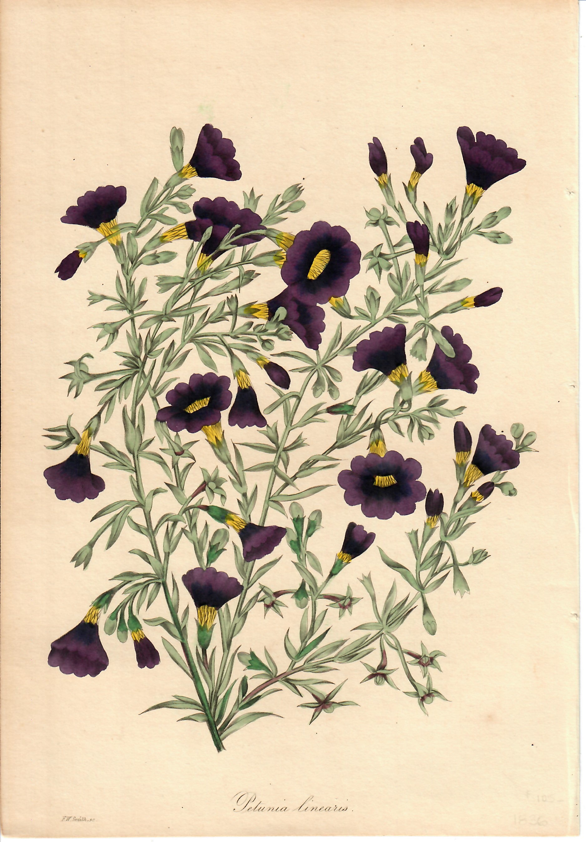 Purple Hand-Colored Botanical, Petunia Linearis, F.W. Smith, 1836